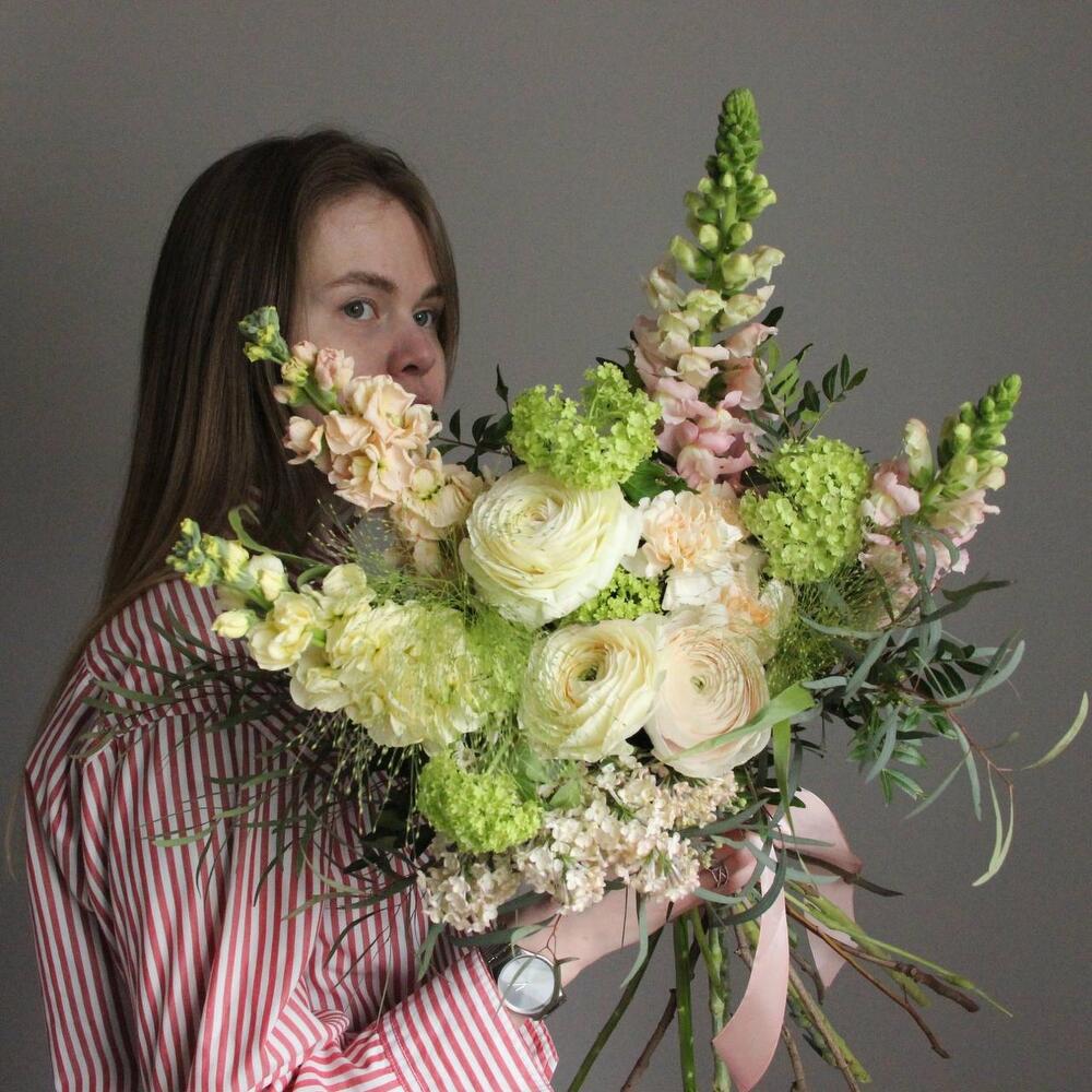 Вибурнум – 2 шт.Лента – 1 шт.Маттиола – 2 шт.Паникум – 2 шт.Сирень – 1 шт.Эвкалипт – 5 шт.Гвоздика – 3 шт.Ранункулюс – 3 шт.Львиный зев – 3 шт.