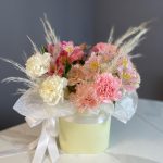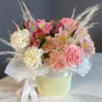 Альстромерия – 3 шт.Гвоздика – 9 шт.Лента атласная – 1 шт.Тишью – 1 шт.Сухоцветы – 3 шт.Шляпная коробка – 1 шт.Оазис флористический – 1 шт.