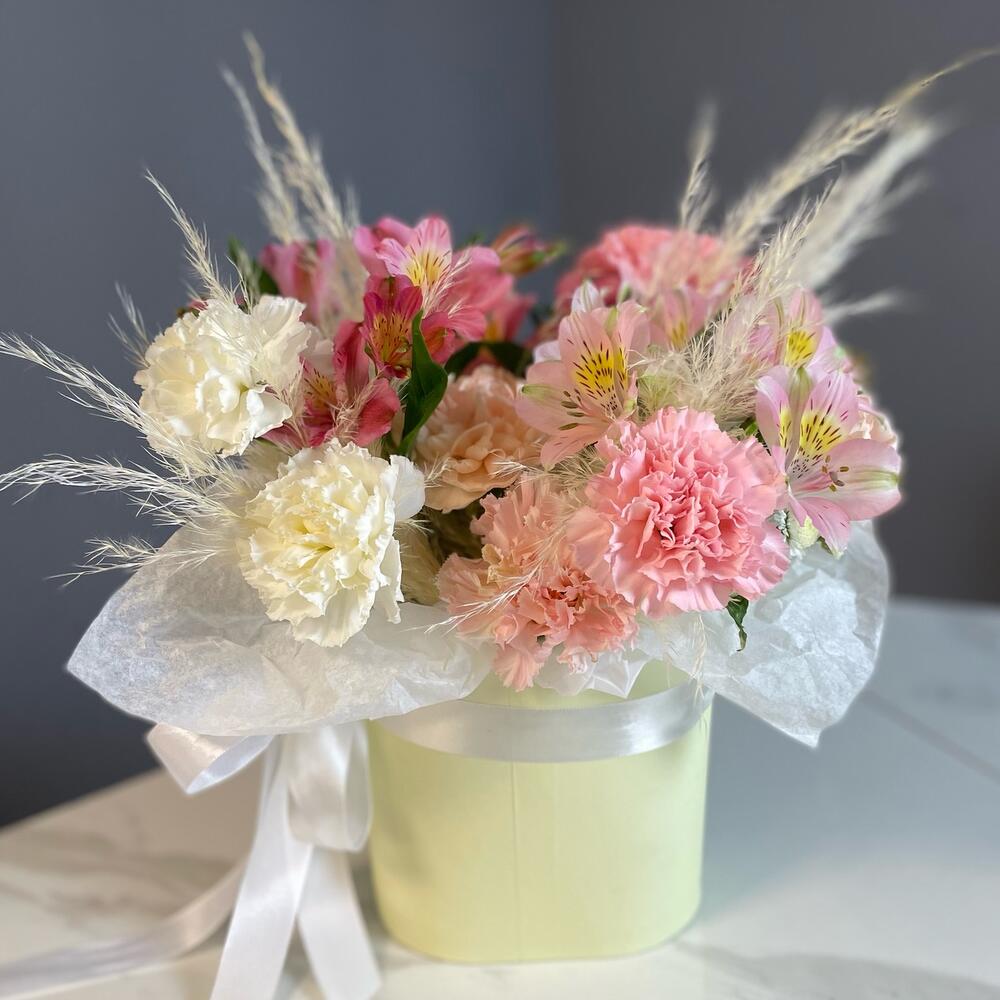 Цветочная композиция из альстромерий и гвоздик в коробке