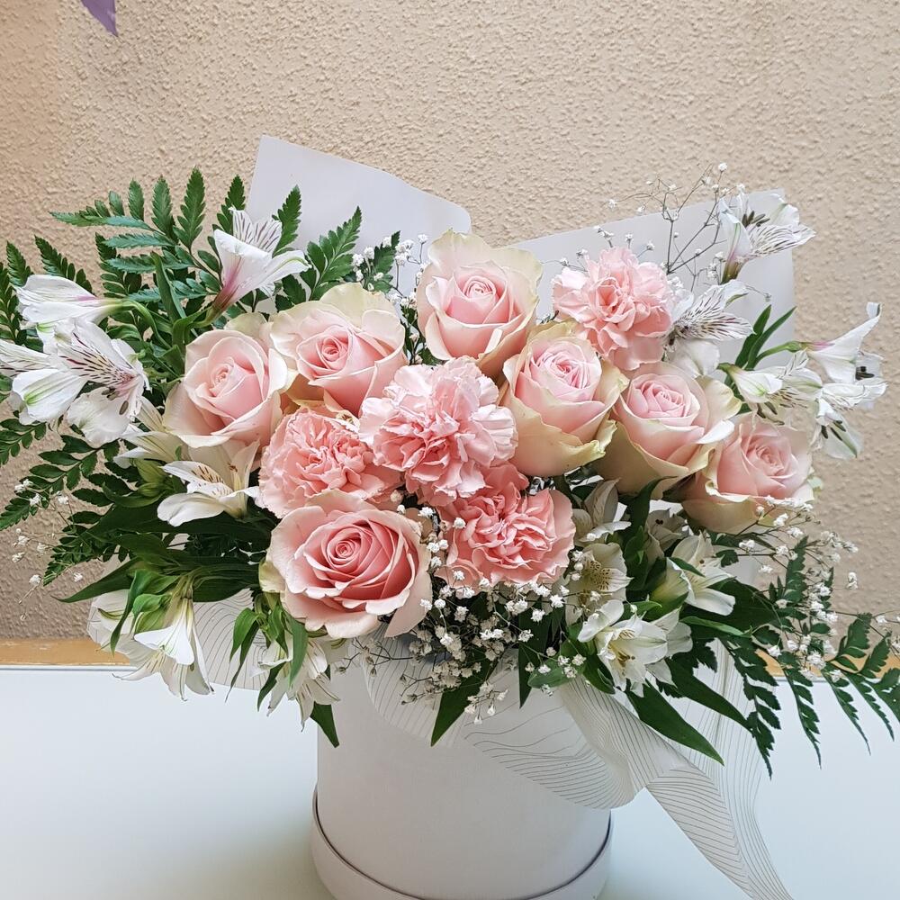 Роза Эквадор – 7 шт.Альстромерия – 4 шт.Гвоздика – 4 шт.Коробка шляпная – 1 шт.бумага дизайнерская – 1 шт.Листья папоротника – 3 шт.
