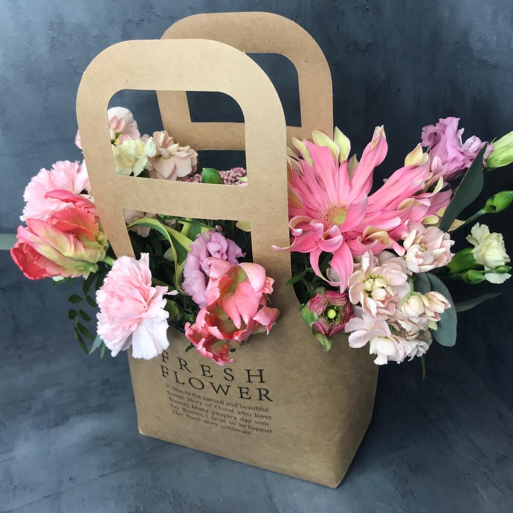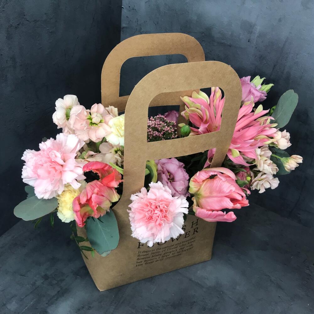 Сумочка крафт – 1 шт.Гербера – 1 шт.Тюльпан – 2 шт.Озотамнус – 1 шт.Маттиола – 2 шт.Диантус – 3 шт.Лизиантус – 1 шт.комплимент от polyanka – 1 шт.