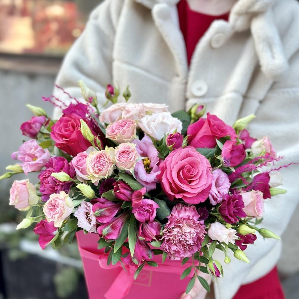 Роза – 3 шт.Роза кустовая – 2 шт.Лизиантус – 2 шт.Альстромерия – 2 шт.Диантус – 4 шт.декоративная зелень – 6 шт.цветы микс – 3 шт.Коробка – 1 шт.Флористическая губка – 1 шт.