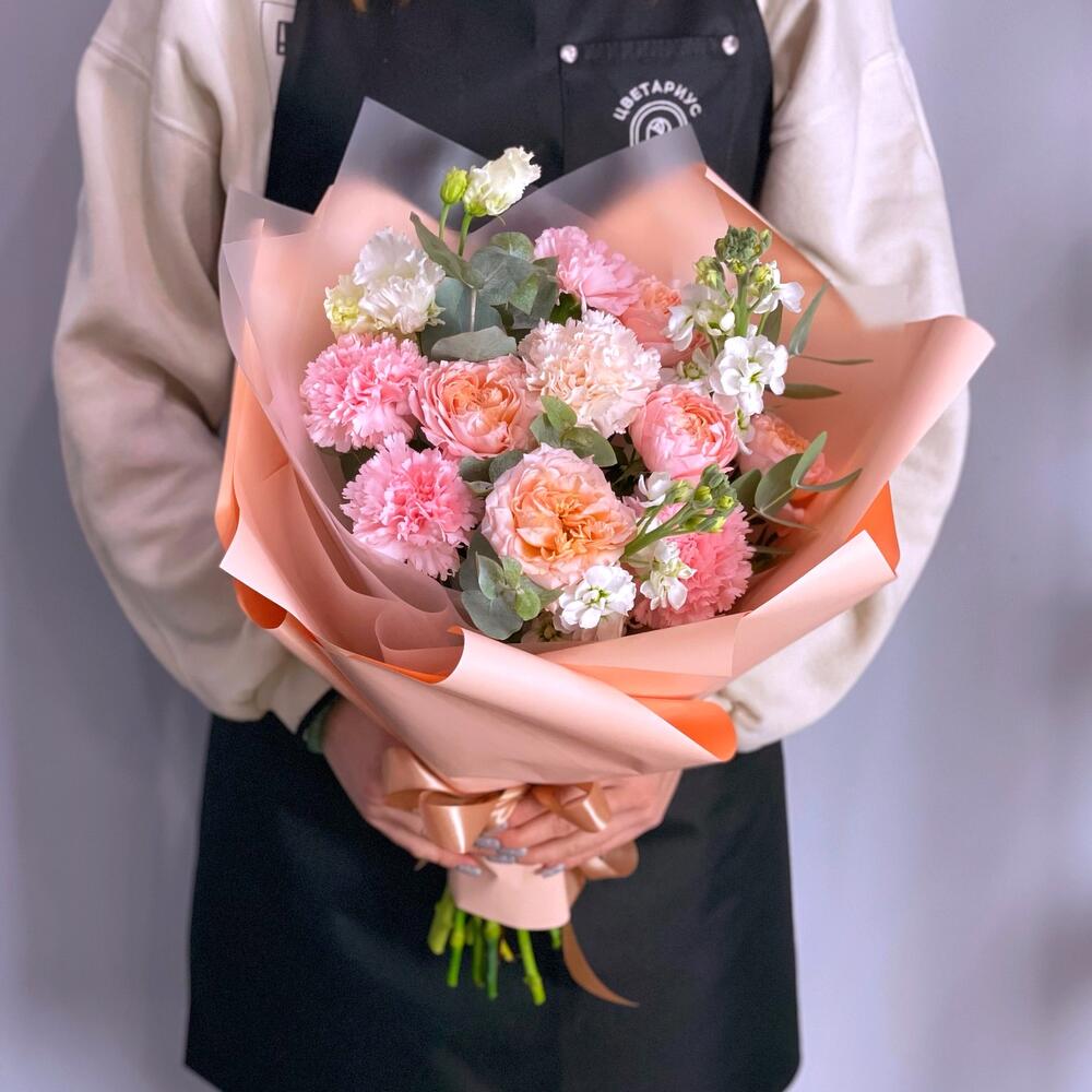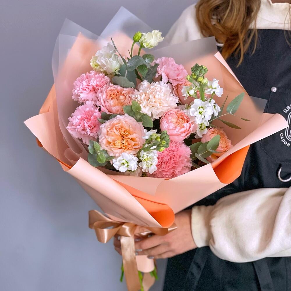 Нежный букет в персиковых тонах с кустовыми пионовидными розами сорта Джульетта, ароматной маттиолой и диантусами порадует любимую девушку, нежную маму, лучшую подругу.