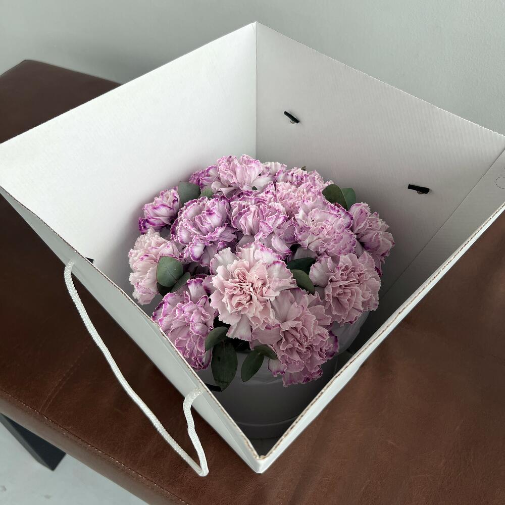Шляпная коробка фиолетовых гвоздик (N 130)