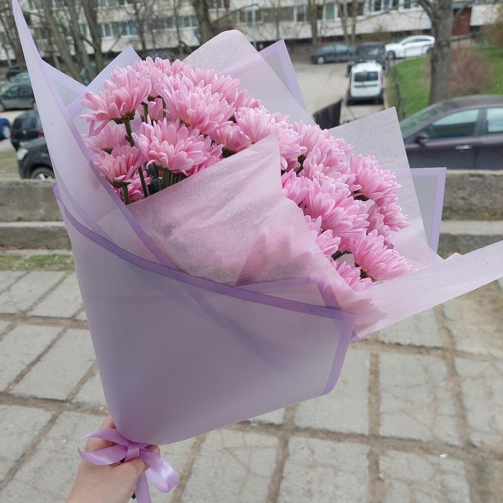 Хризантема – 5 шт.Упаковка дизайнерская – 1 шт.Лента атласная – 1 шт.