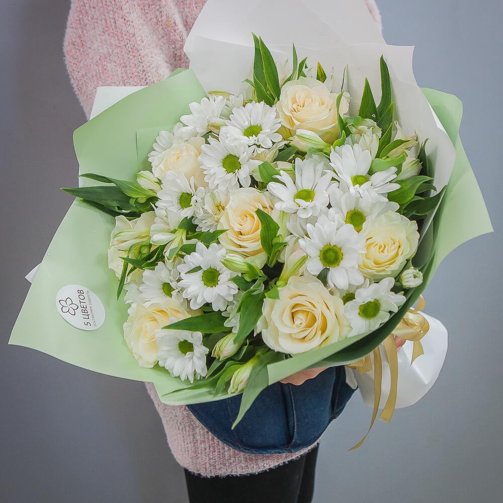 Букет из 7 роз, 3 хризантем и 9 альстромерий белого цвета