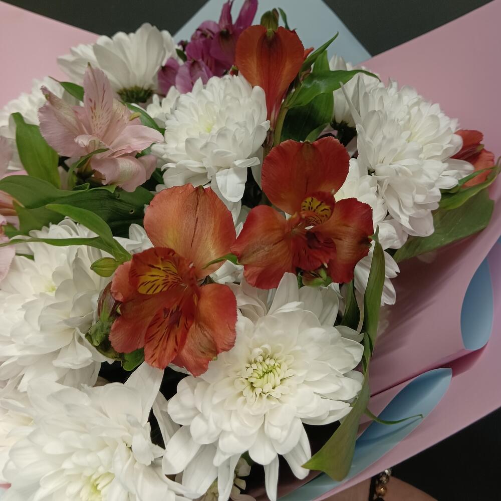Альстромерия – 4 шт.Хризантема кустовая – 3 шт.Упаковка дизайнерская – 1 шт.зелень декоративная – 3 шт.