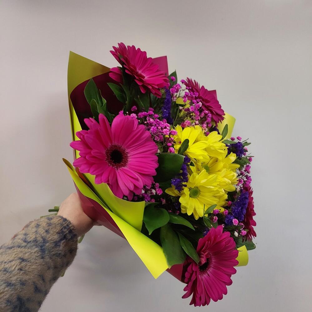 Гербера – 5 шт.Хризантема кустовая – 1 шт.Статица синяя – 2 шт.Гипсофила – 2 шт.Рускус – 15 шт.Упаковка дизайнерская – 1 шт.Лента – 1 шт.