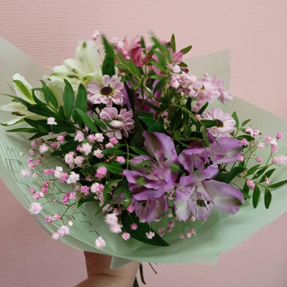 Альстромерия – 3 шт.Хризантема Сантини – 4 шт.Упаковка – 1 шт.Лента атласная – 1 шт.зелень декоративная – 2 шт.гипсофила радужная – 1 шт.