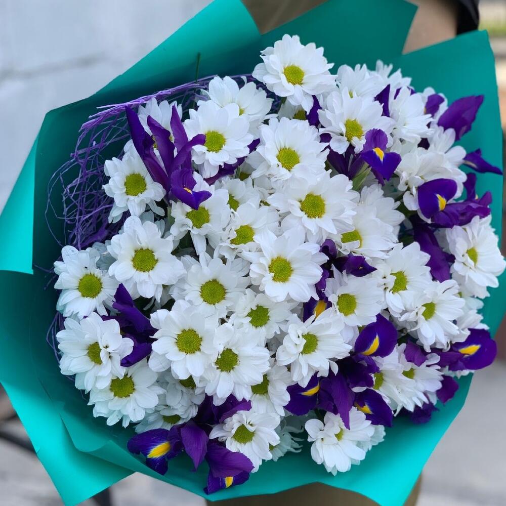 Хризантема кустовая – 9 шт.Ирис Blue Magic – 9 шт.Зелень – 5 шт.Лента атласная – 1 шт.