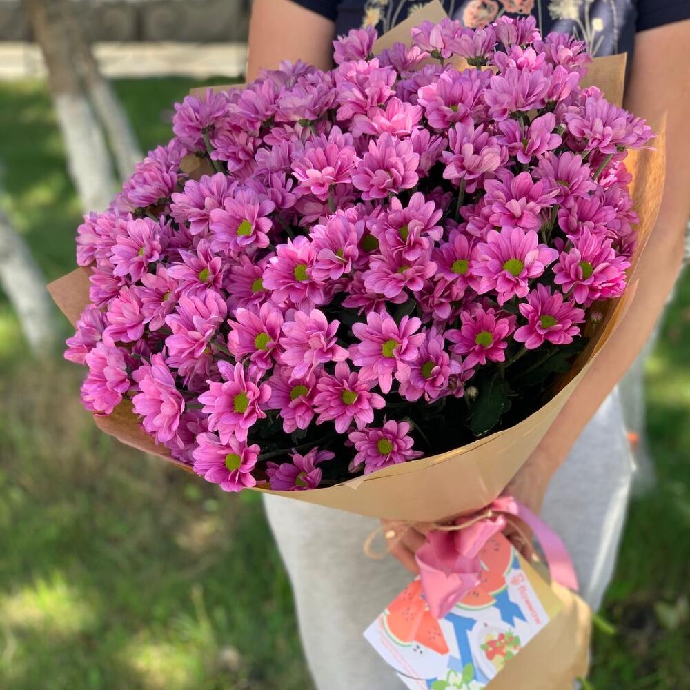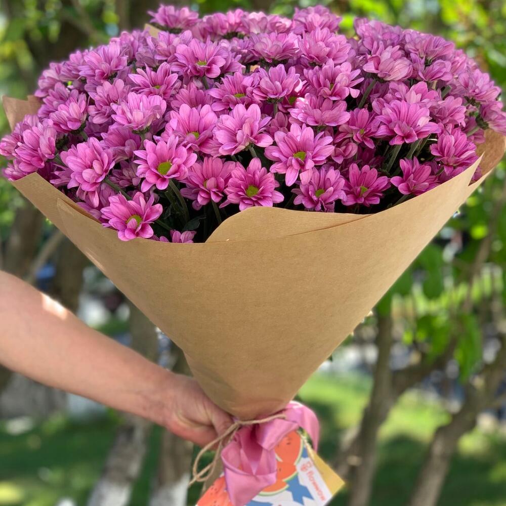 Хризантема кустовая – 15 шт.Крафт – 1 шт.Лента атласная – 1 шт.