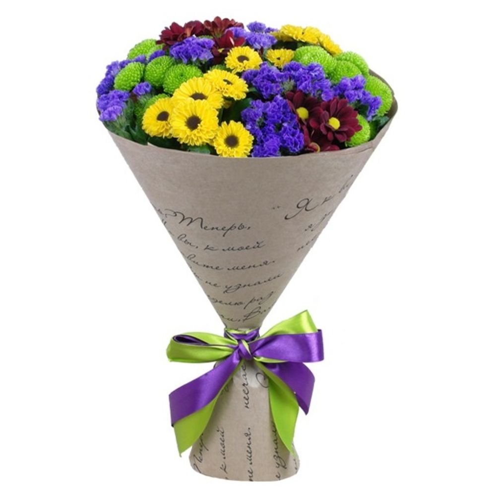 лента декоративная – 1 шт.бумага упаковочная – 1 шт.Статица синяя – 2 шт.Хризантема сантини желтая – 2 шт.Хризантема сантини зеленая – 2 шт.хризантема сантини красная – 2 шт.