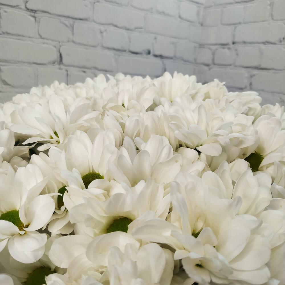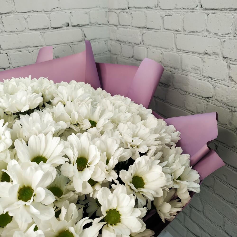 Прекрасный букет из белых хризантем, станет идеальным подарком для самых любимых и близких!Памятка для букета:1. Чистая вода раз в сутки.2. Стебли подрезаем на 0,5см при каждой смене воды.3. Ставим в прохладное место, но не у окна.4. Чтобы вода оставалась свежей, не допускайте попадания листьев и лепестков в воду.Друзья, обратите внимание, что цвет упаковки может быть другим, в зависимости от наличия на складе.