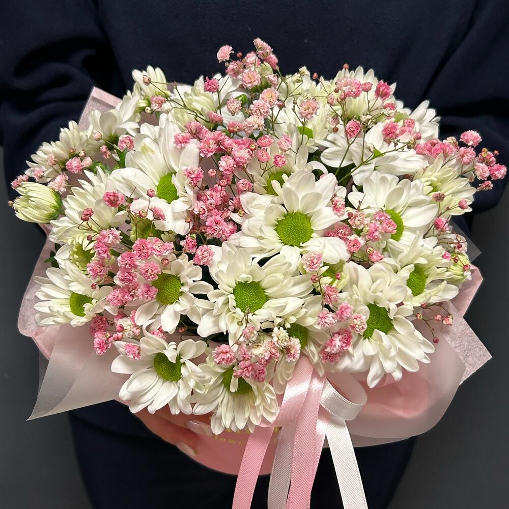 Коробка шляпная – 1 шт.Пиафлор (оазис) – 1 шт.Гипсофила – 3 шт.Хризантема кустовая – 5 шт.
