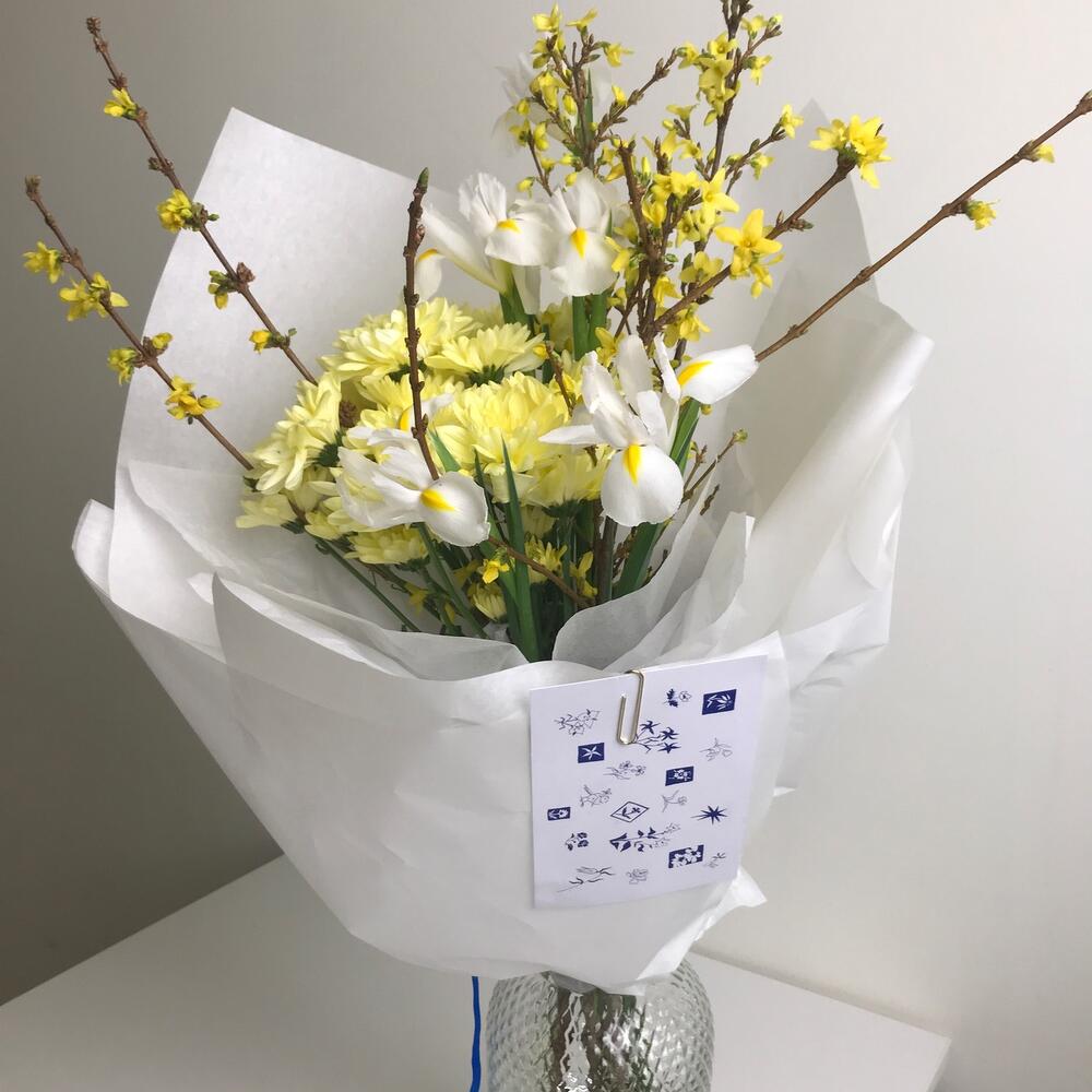 Форзиция – 4 шт.Ирис белый – 5 шт.хризаентема кустовая – 3 шт.