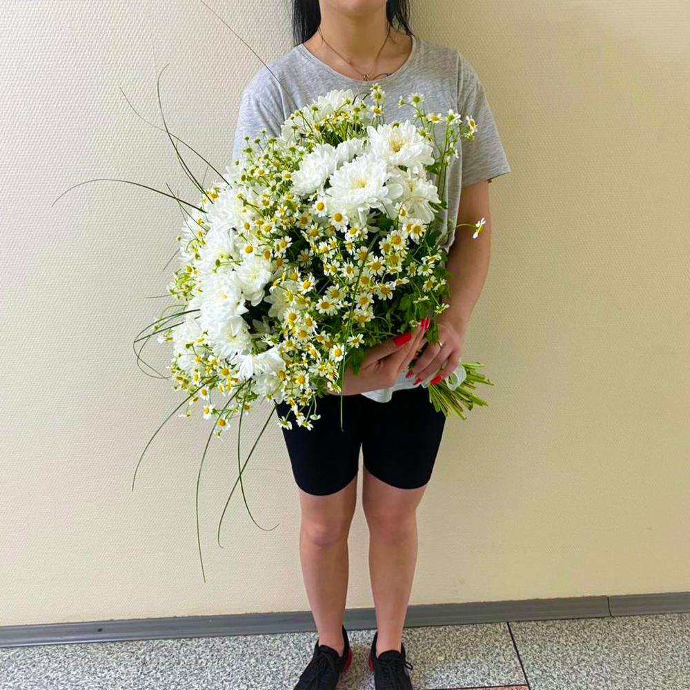 Матрикария – 25 шт.Хризантема кустовая – 5 шт.Лента атласная – 2 шт.