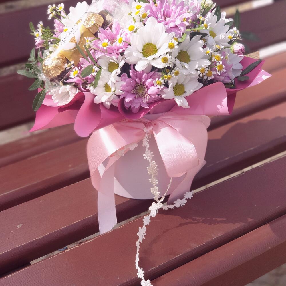 Хризантема кустовая – 3 шт.Лента атласная – 1 шт.Коробка шляпная – 1 шт.Ромашка кустовая – 2 шт.Открыточка с вашими пожеланиями – 1 шт.тесьма кружево – 1 шт.шоколад ферреро – 1 шт.любовь флориста (бесплатно) – 1 шт.