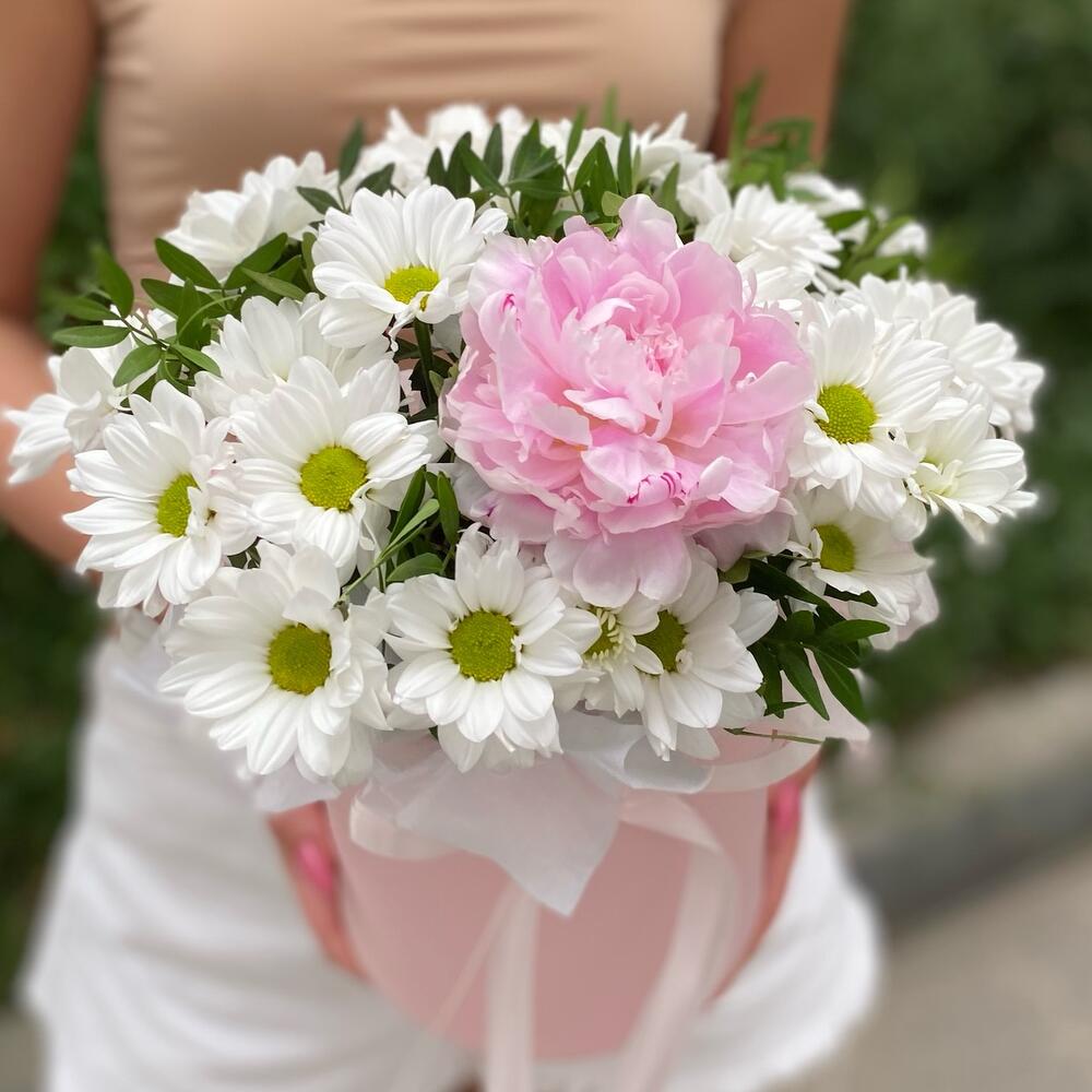 Пион – 1 шт.Тишью – 3 шт.Коробка шляпная – 1 шт.Фисташка – 4 шт.Хризантема ромашка – 4 шт.Оазис флористический – 1 шт.