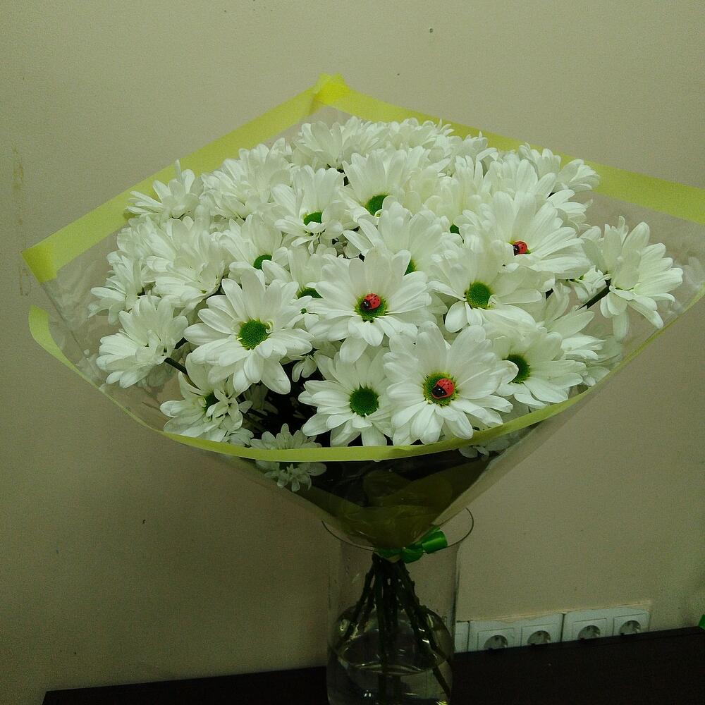 Лента – 1 шт.Хризантема кустовая белая – 9 шт.Упаковка дизайнерская – 1 шт.декоративные элементы – 3 шт.