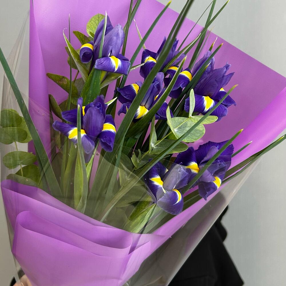 Букет из ярких фиолетовых ирисов и ароматного эвкалипта