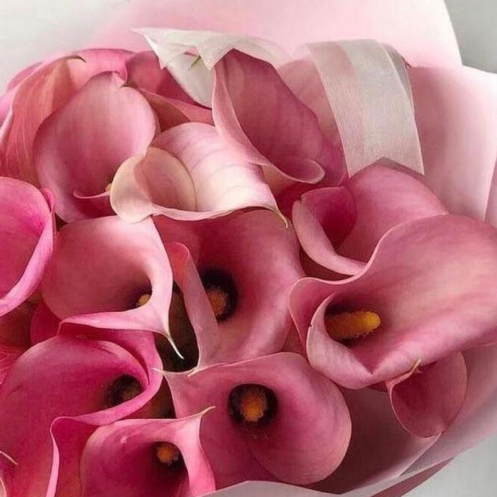 Калла розовая – 19 шт.Упаковка дизайнерская – 1 шт.Лента атласная – 2 шт.Открыточка с вашими пожеланиями – 1 шт.хорошее настроение – 100 шт.инструкция по уходу за цветами – 1 шт.коробка переноска – 1 шт.Кризал – 1 шт.