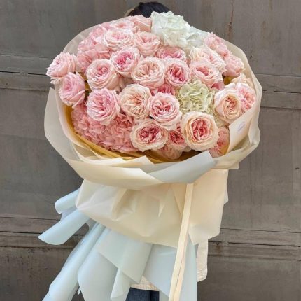 Шикарная корзина с гортензией,пионами и лизиантусом