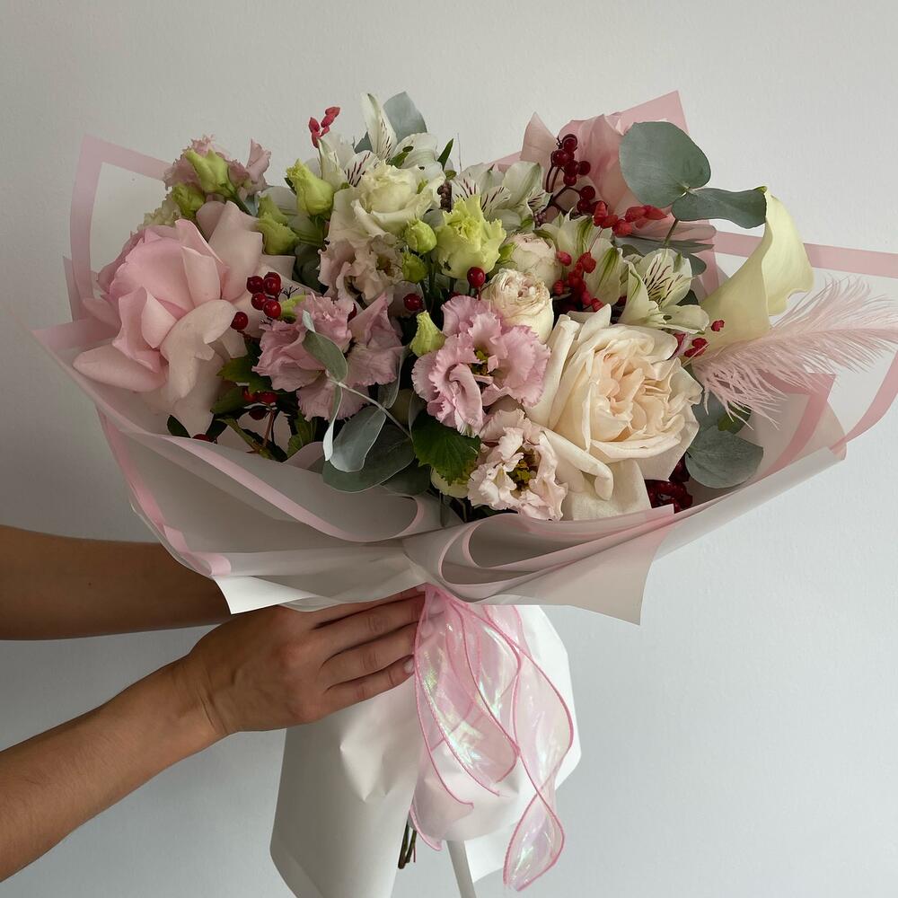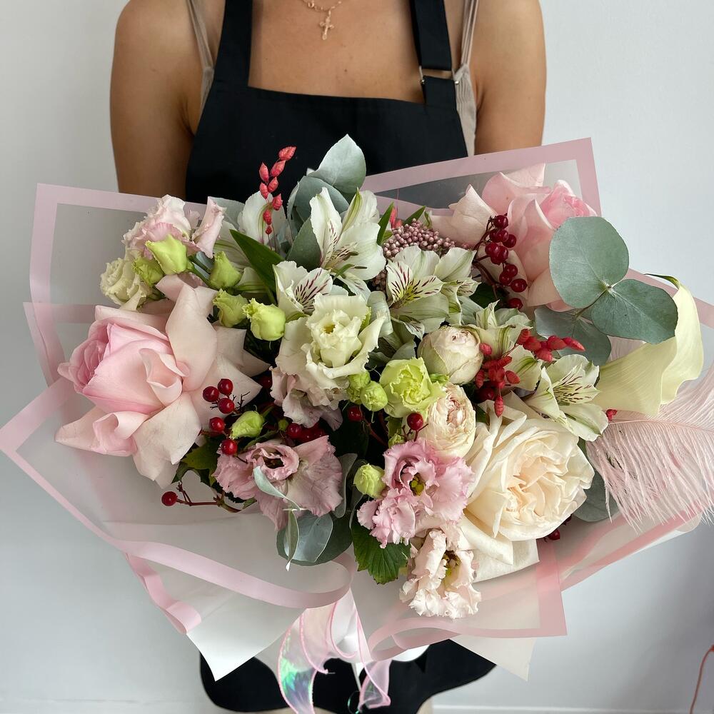 Альстромерия – 4 шт.Гиперикум – 1 шт.Роза Эквадор – 2 шт.Эустома – 3 шт.Лента атласная – 2 шт.Роза пионовидная – 1 шт.Кустовая пионовидная роза – 2 шт.Пленка матовая – 6 шт.зелень декоративная – 4 шт.перо декоративное – 1 шт.