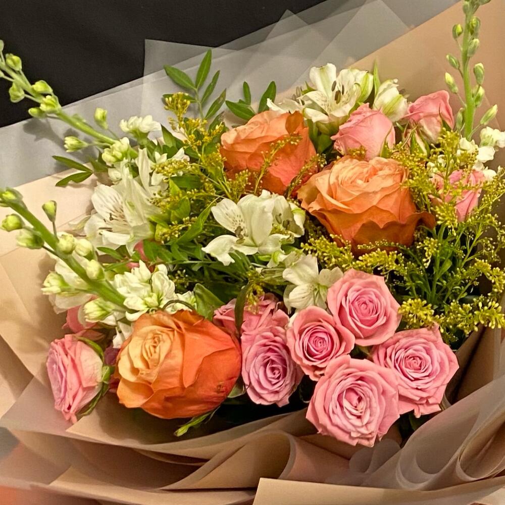 Альстромерия – 3 шт.Солидаго – 2 шт.Кустовая роза – 3 шт.Лента атласная – 2 шт.Фисташка – 3 шт.Упаковка дизайнерская – 2 шт.Маттиола белая – 3 шт.пионовидная роза премиум – 3 шт.