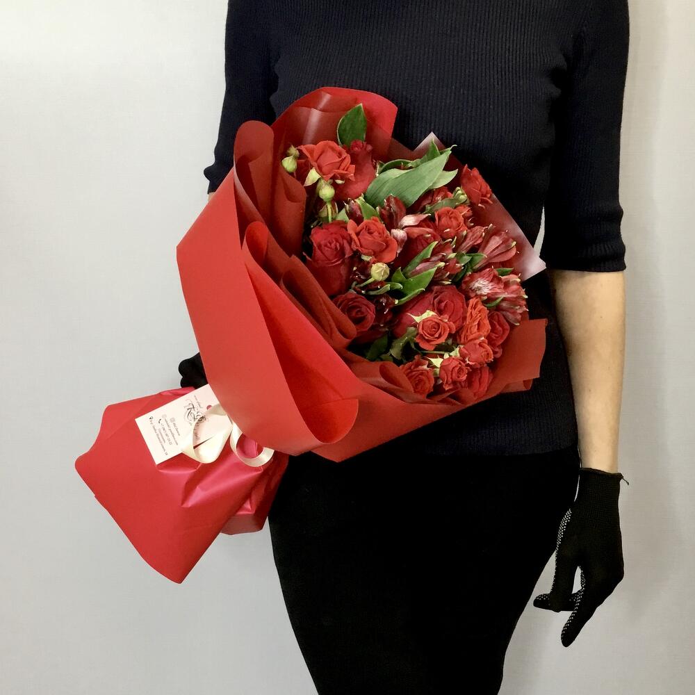 Букет с розами, альстромерией и кустовой розой «Рубин»