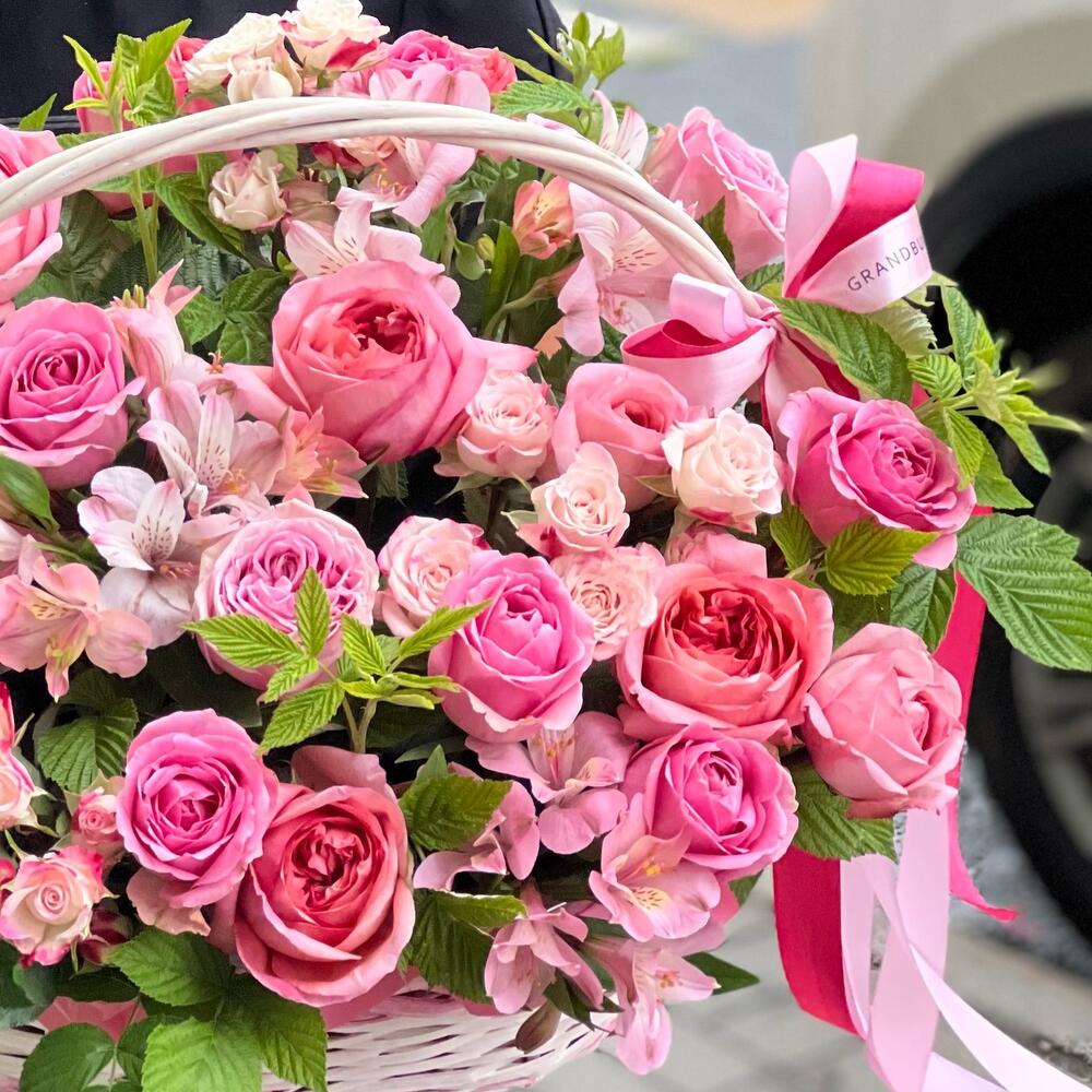 пионовидные розы – 15 шт.Роза кустовая – 5 шт.Роза одноголовая – 11 шт.Альстромерия – 3 шт.малина зелень – 20 шт.Корзина плетеная – 1 шт.Оазис флористический – 2 шт.Лента атласная – 3 шт.работа флориста – 1 шт.