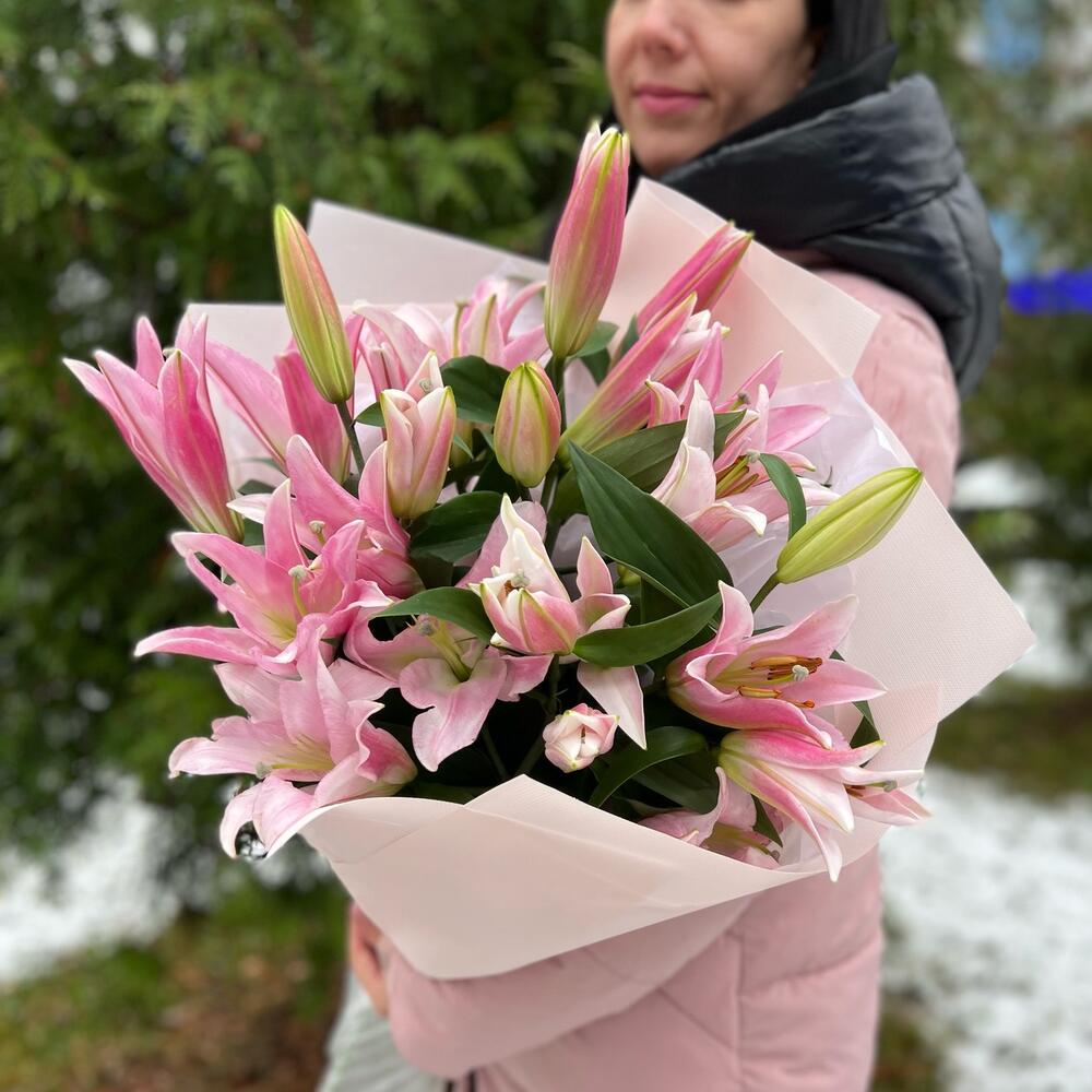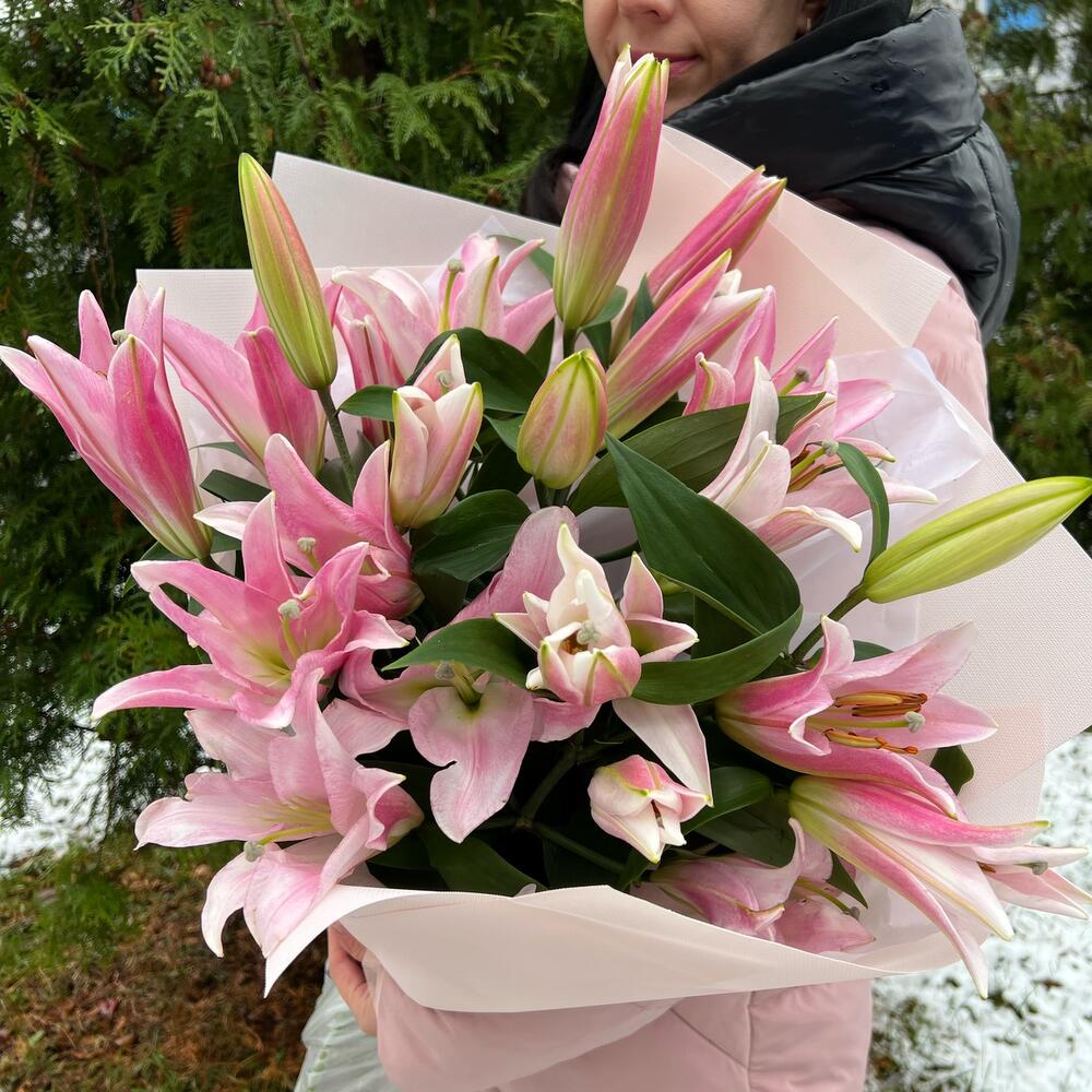 Лилия розовая – 5 шт.Тишью – 2 шт.структурированны фаомиран – 3 шт.