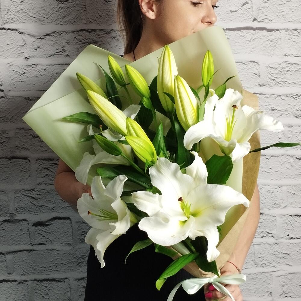 Упаковка – 1 шт.Лента атласная – 1 шт.Лилия белая – 5 шт.