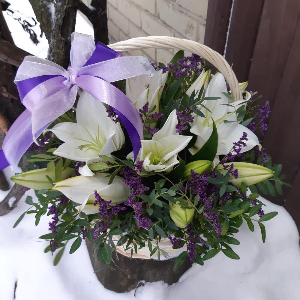 Лилия – 3 шт.Лимониум сиреневый – 3 шт.Фисташка – 5 шт.Эвкалипт – 6 шт.Корзина плетеная – 1 шт.Оазис флористический – 1 шт.Лента атласная – 2 шт.органза лента – 1 шт.