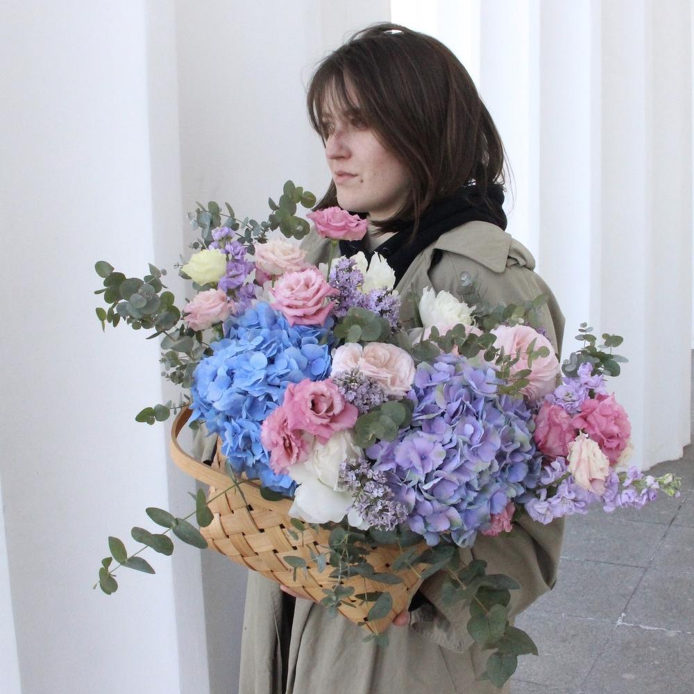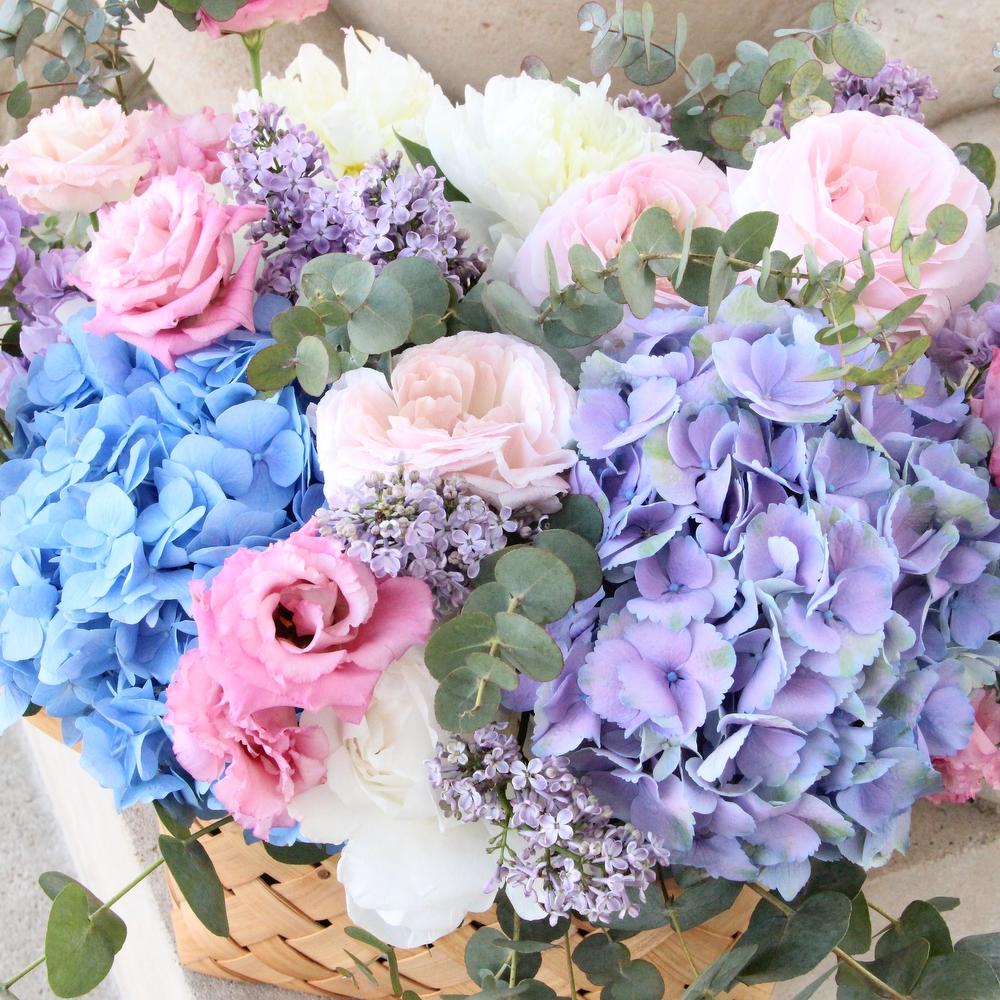 Гортензия – 2 шт.Лизиантус – 7 шт.Маттиола – 5 шт.Пион – 9 шт.Эвкалипт – 13 шт.Флокс – 4 шт.Оазис флористический – 2 шт.Лукошко плетеное – 1 шт.