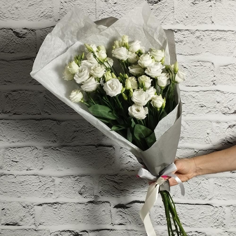 Эустома – 7 шт.Упаковка – 2 шт.Лента атласная – 1 шт.