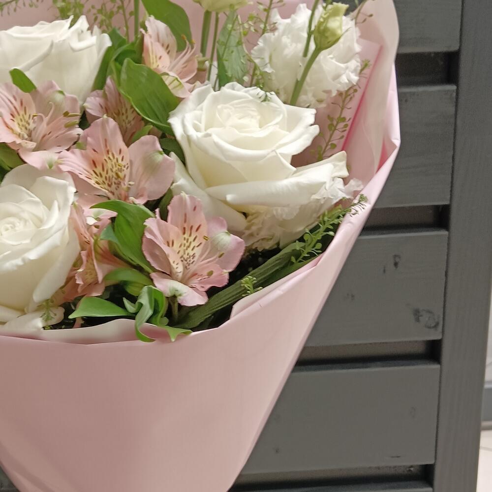 Альстромерия – 2 шт.Лизиантус – 2 шт.Роза – 3 шт.Упаковка дизайнерская – 1 шт.зелень декоративная – 1 шт.
