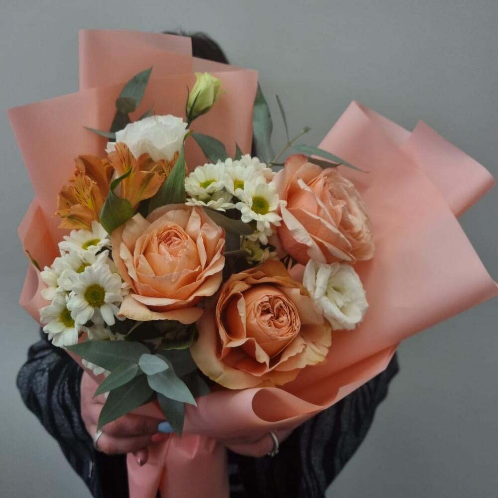 кахала роза – 3 шт.Сантини – 2 шт.Эустома – 1 шт.Альстромерия – 1 шт.Эвкалипт – 1 шт.Упаковка дизайнерская – 1 шт.