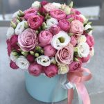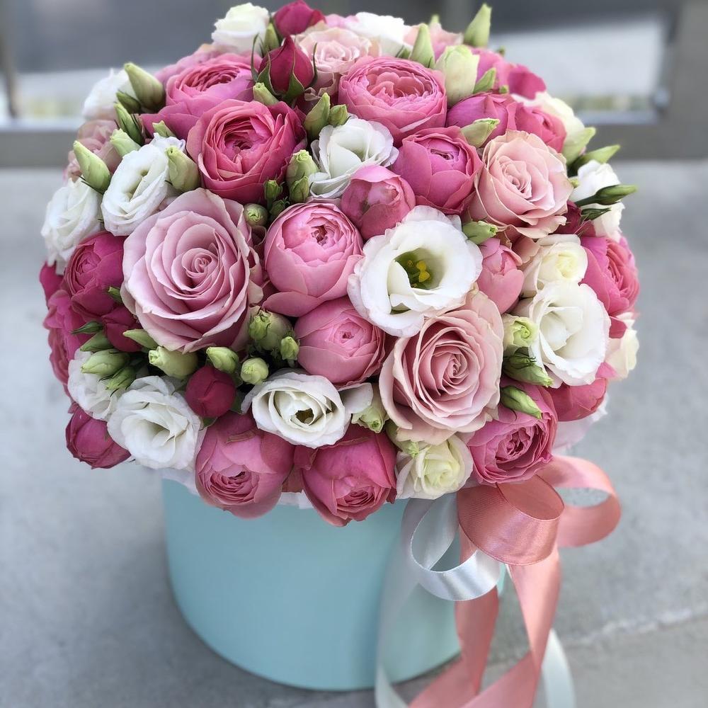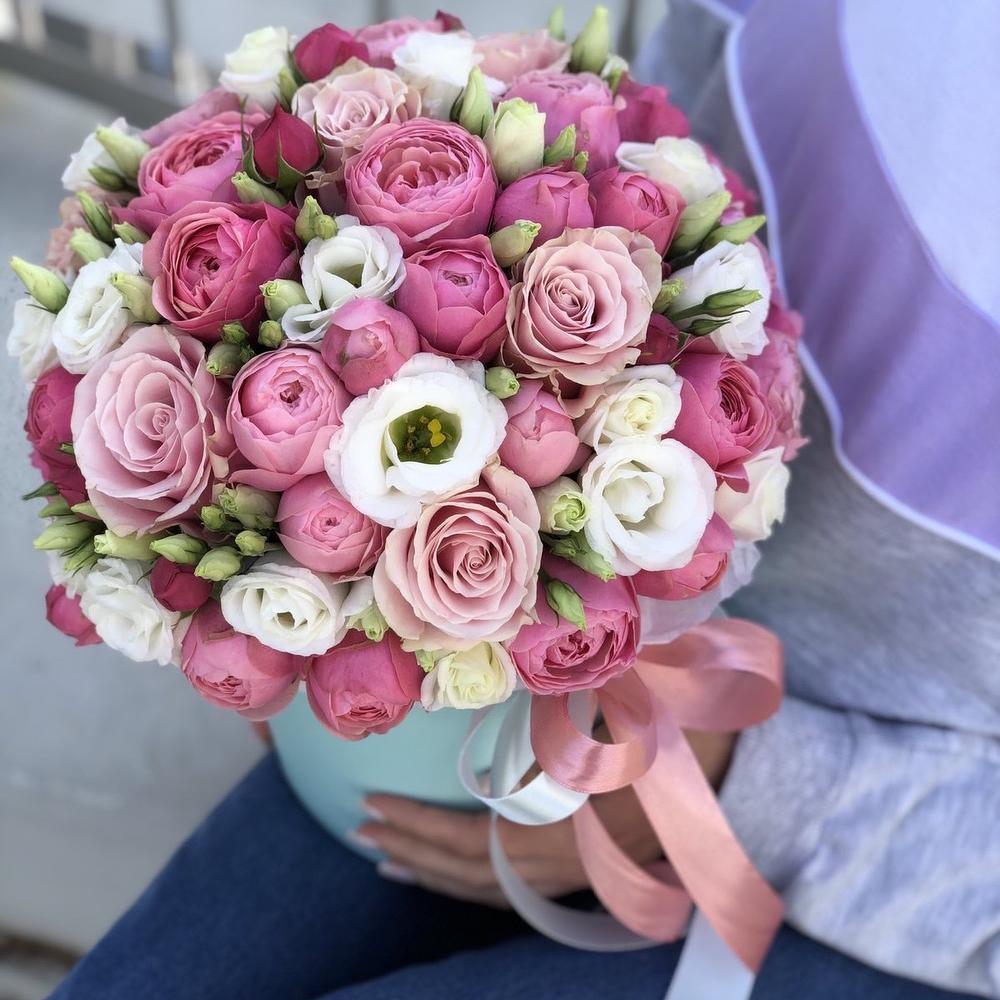 Сильвия – 12 шт. эустома белая – 5 шт. пинк мондиаль – 8 шт. Коробка шляпная – 1 шт. Оазис – 1 шт. Оформление лента – 1 шт.