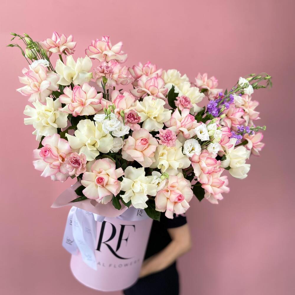Цветы в коробке. 51роза и эвкалипт в шляпной коробке