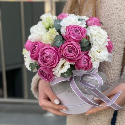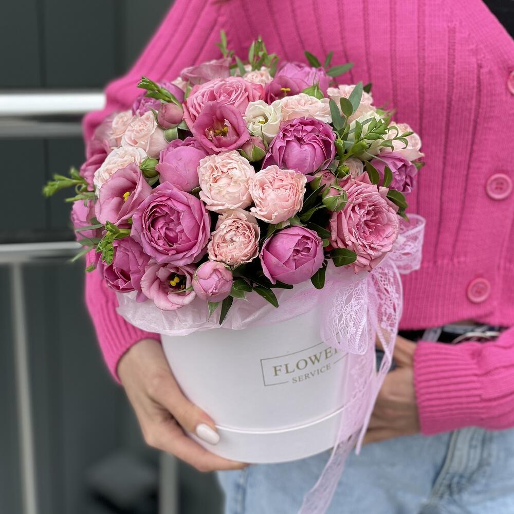 Коробка Трогательные чувства из эустомы и пионовидных роз