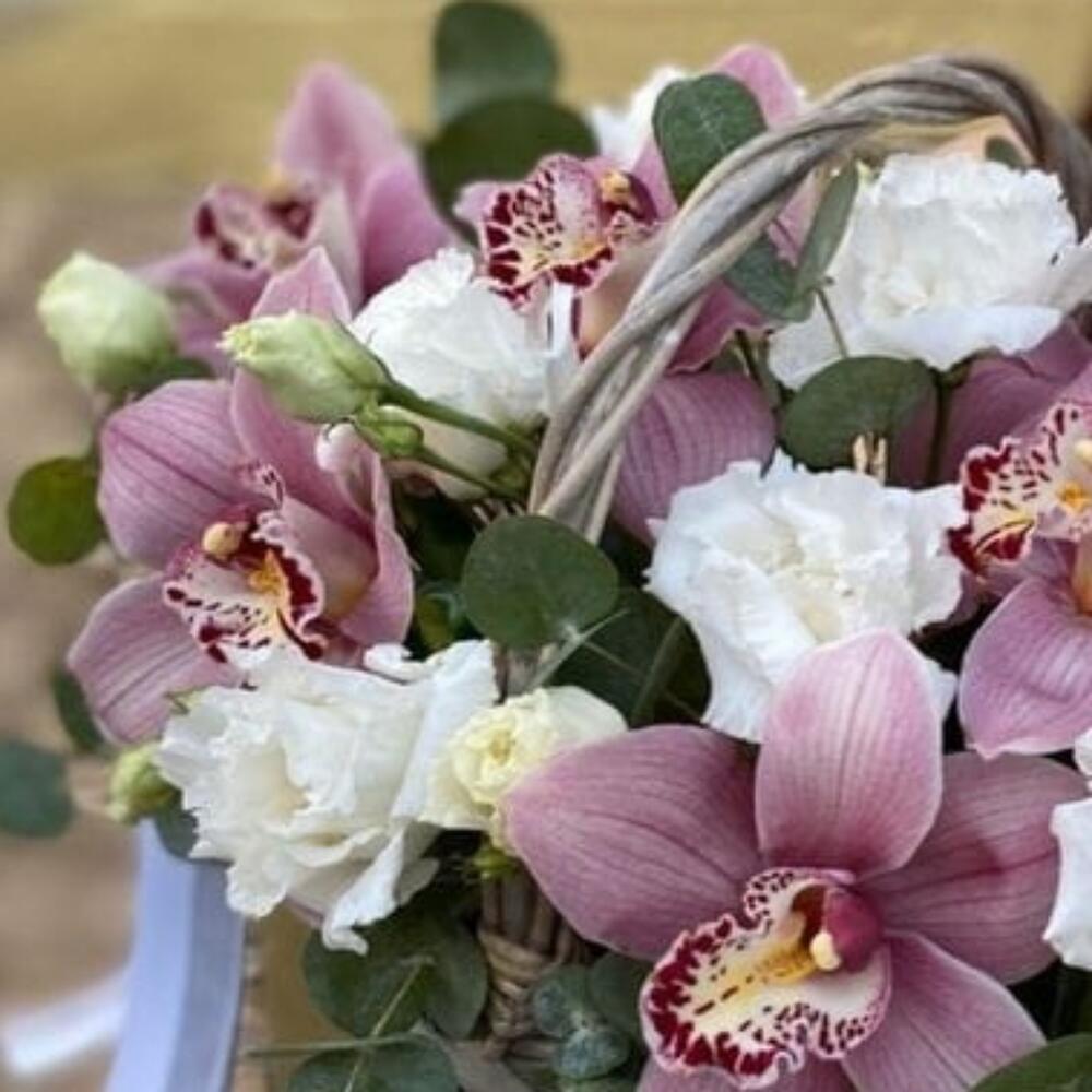 Цимбидиум белый – 9 шт.Лизиантус – 7 шт.Эвкалипт пучок – 1 шт.Фисташка – 1 шт.Корзина плетеная – 1 шт.Оазис флористический – 2 шт.