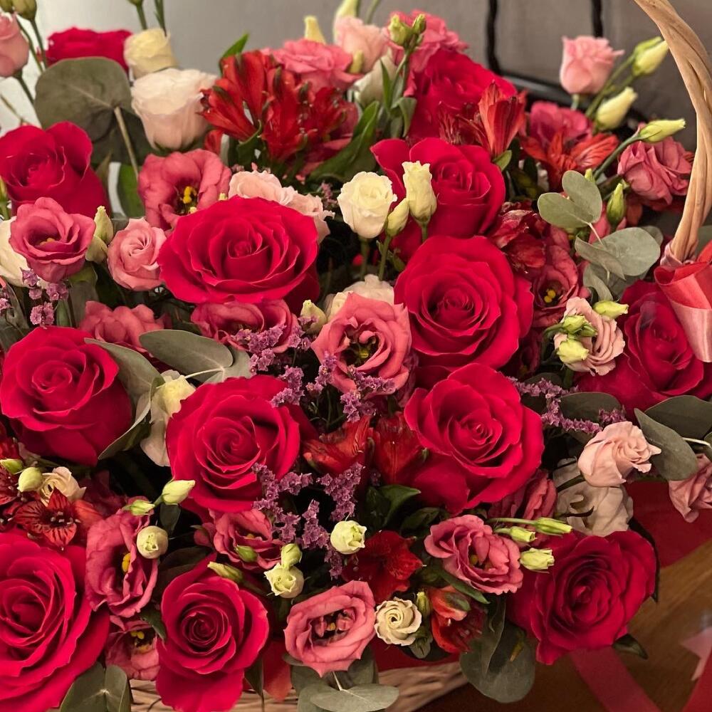 яркие розы – 15 шт.Эустома – 11 шт.Альстромерия – 9 шт.Эвкалипт – 17 шт.Корзина плетеная – 1 шт.Оазис флористический – 2 шт.Лента атласная – 2 шт.работа флориста – 1 шт.Пленка прозрачная – 1 шт.