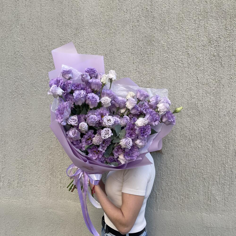 эустома (веток) – 15 шт. флористическая зелень (веток) – 3 шт. Упаковка – 1 шт. Атласная лента – 1 шт.