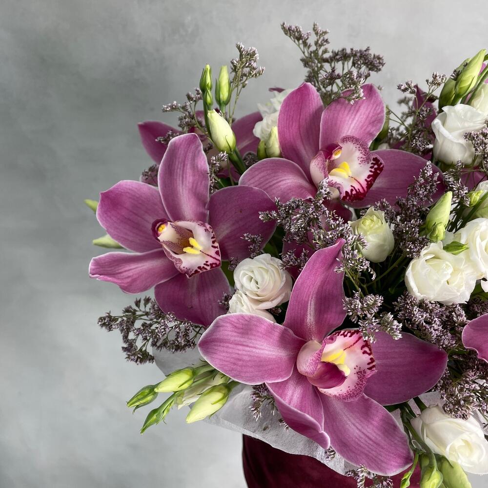 Шляпная коробка гортензией, пионами, эустомой, тюльпанами, гиацинтами, фрезией и гвоздикой "Джоанна"