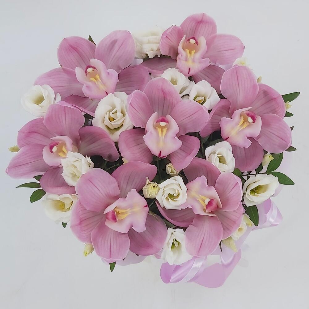 Розовые орхидеи с эустомой в коробке