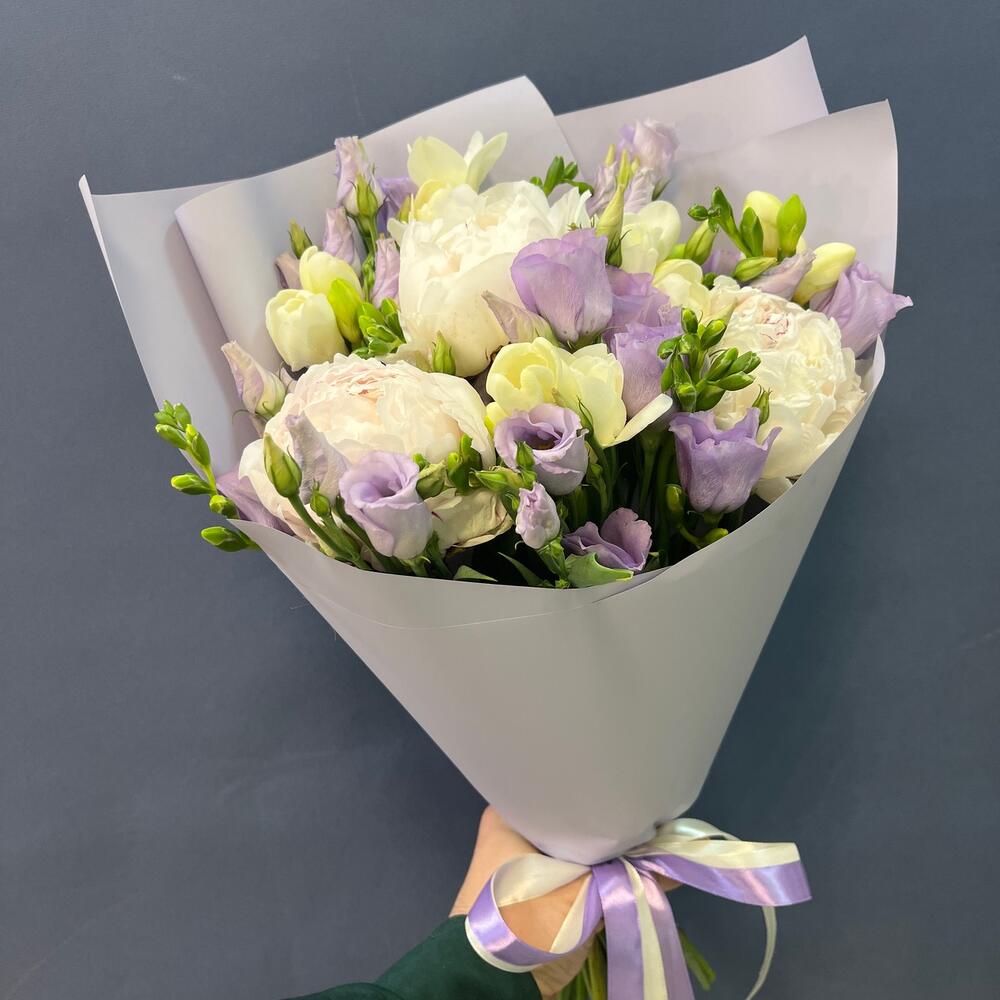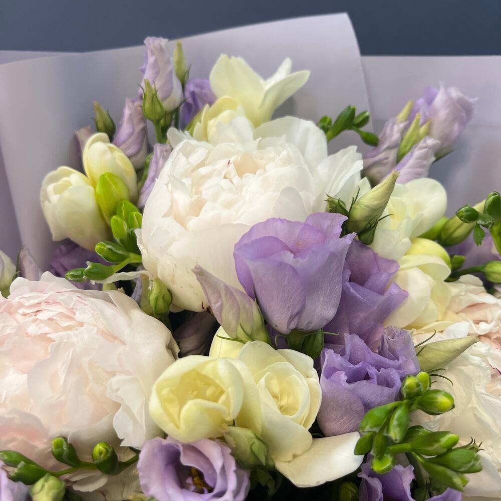 Лизиантус лавандовый – 4 шт.Лента атласная кремовая – 1 шт.Упаковка корейская пленка – 1 шт.лента атласная лавандовая – 1 шт.пион белый премиум – 3 шт.фрезии белая – 5 шт.