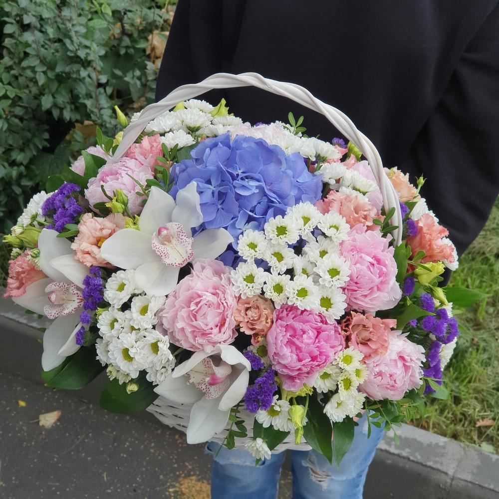 Корзина – 1 шт.Оазис флористический – 2 шт.Гортензия – 1 шт.Пион – 9 шт.Орхидея Цимбидиум – 3 шт.Статица – 3 шт.Лизиантус – 4 шт.Сантини – 5 шт.Зелень – 10 шт.