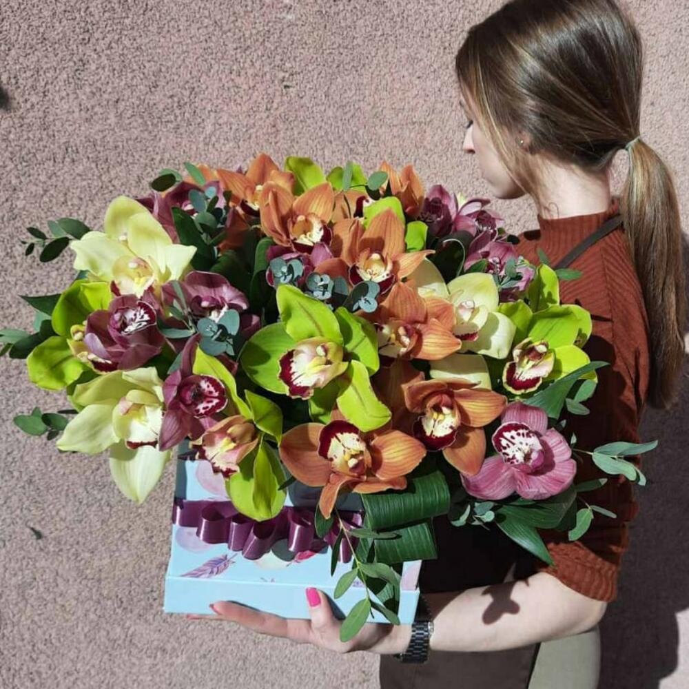 Орхидея Цимбидиум – 41 шт.Оазис флористический – 1 шт.Эвкалипт – 10 шт.Коробка квадратная – 1 шт.