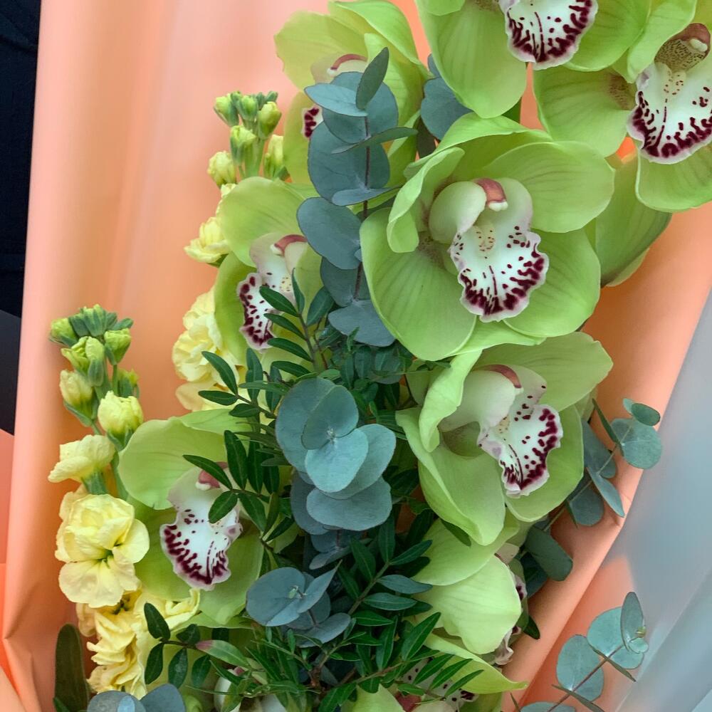 орхидея – 1 шт.Эвкалипт – 1 шт.левкое – 2 шт.Зелень – 2 шт.Дизайнерская упаковка – 3 шт.