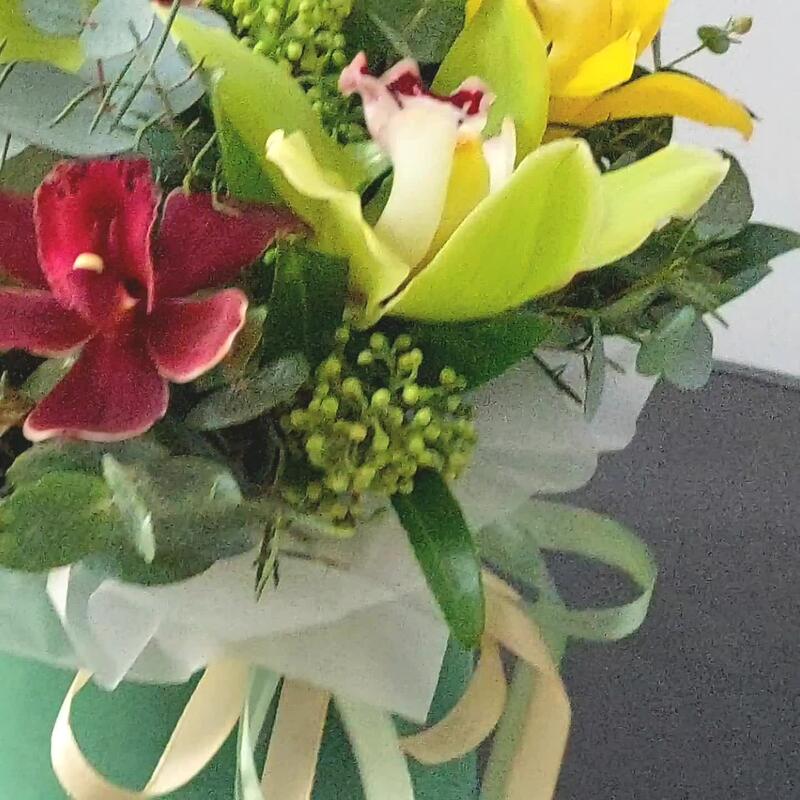 Лента атласная – 2 шт.Скиммия – 5 шт.Коробка шляпная бархатная – 1 шт.Пленка матовая – 1 шт.Орхидея цимбидиум желтая – 3 шт.Открыточка с вашими пожеланиями – 1 шт.Орхидея цимбидиум фисташковая – 3 шт.Оазис флористический – 1 шт.Эвкалипт Baby Blue – 5 шт.орхидея цимбидиум красная – 3 шт.